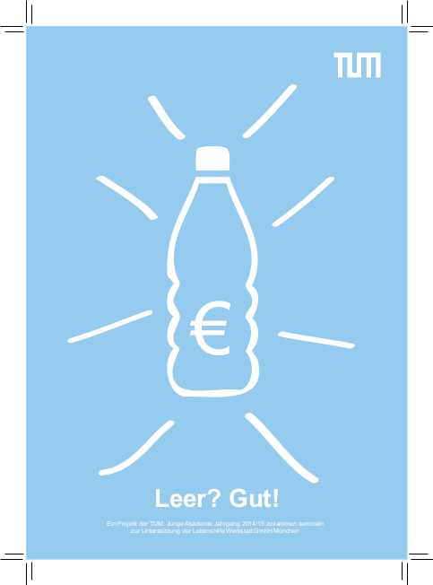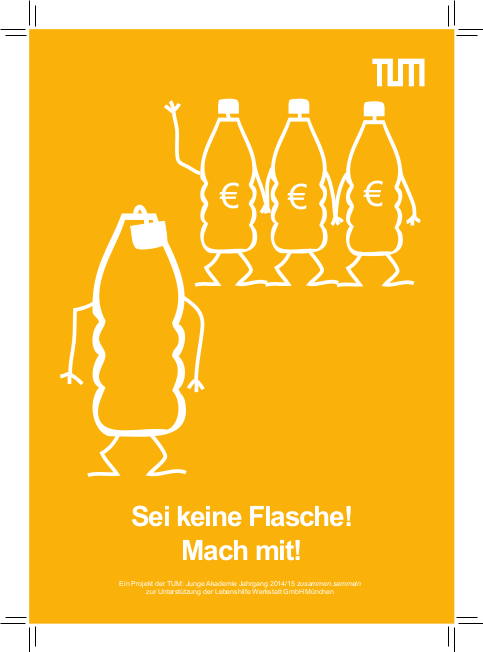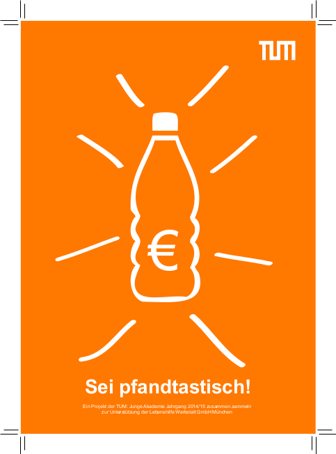 Studierenden und Mitarbeiter an der TUM konnten ihre Pfandflaschen spenden. Der gesamte Erlös aus dem Pfand ging an die Lebenshilfe Werkstatt München. Außerdem wurde mit den gesammelten Deckeln die Aktion "500 Deckel für ein Leben ohne Kinderlähmung" unterstützt, die von Rotary-und Rotaract-Clubs organisiert wird.