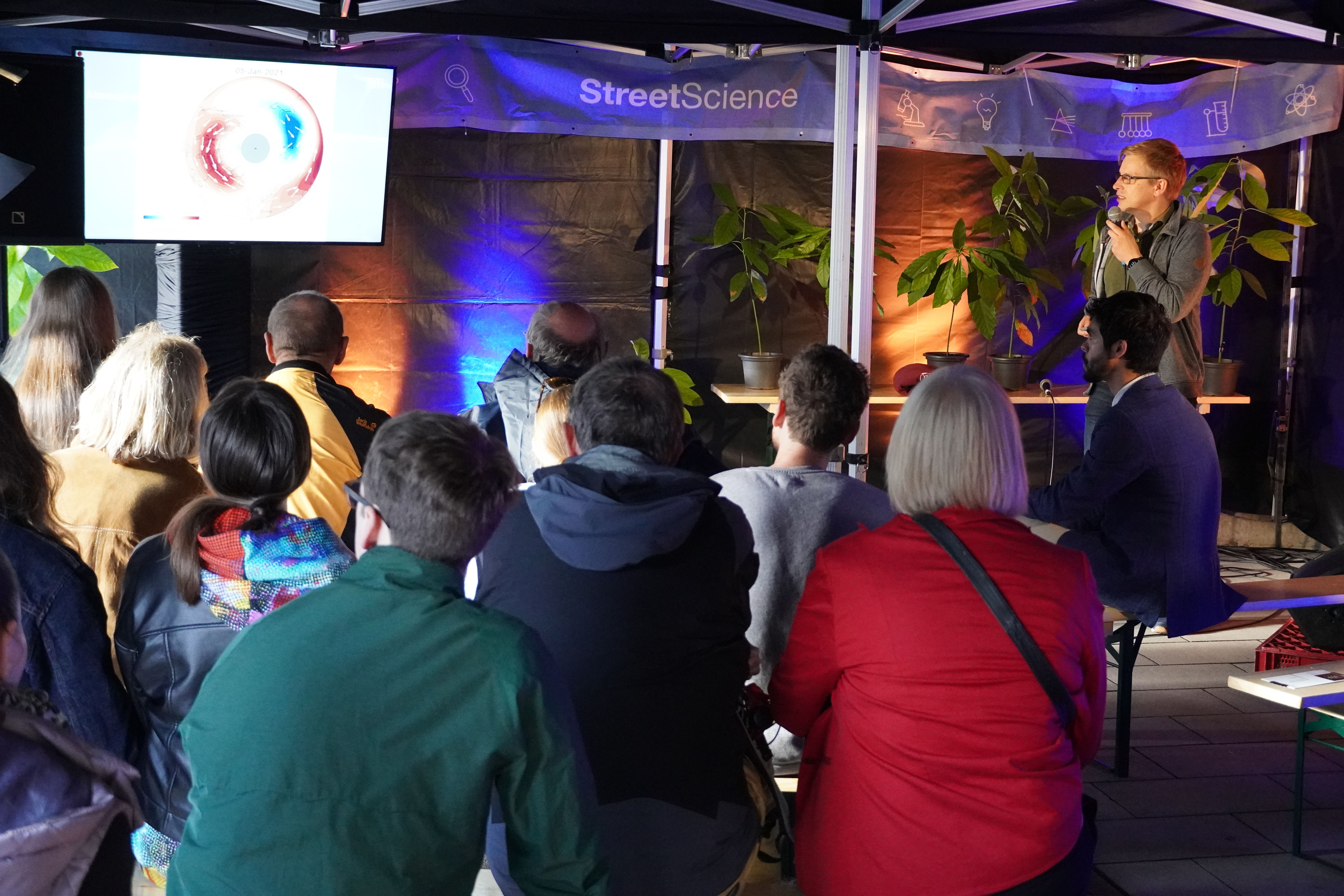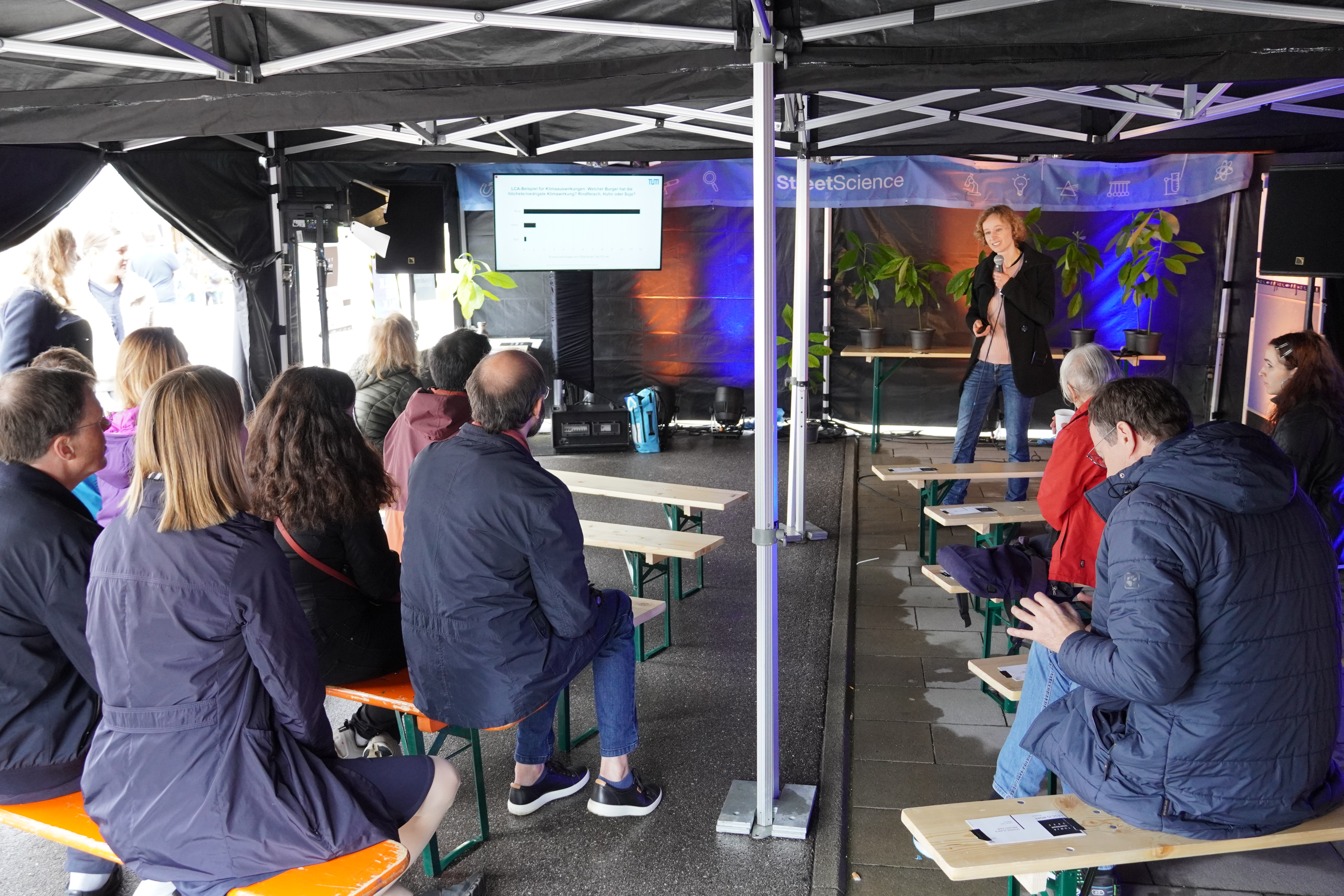 The first day of STREET SCIENCE started under tough conditions. A heavy rainstorm made setting up and beginning the event a real challenge. Nevertheless, visitors bravely arrived with umbrellas and rain gear. Despite the weather, neither exhibitors nor visitors were deterred. Lively discussions and exciting presentations took place under pavilions and umbrellas. Scientists showcased their projects, demonstrating their flexibility and creativity. Improvised solutions and unexpected moments made the rainy day a unique experience.