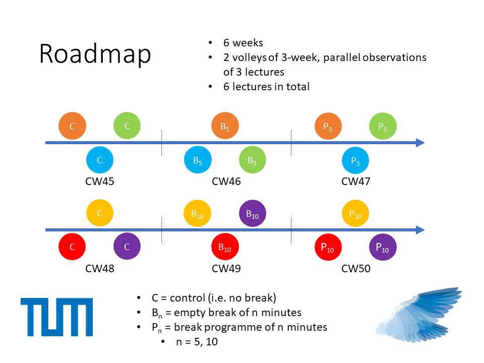 Our intention was to assess the effectiveness of lecture breaks and the perceived attention levels of TUM students. We accomplished this by comparing the current status quo (no lecture break) to various lengths and types of breaks (normal break vs. physical activity break).
