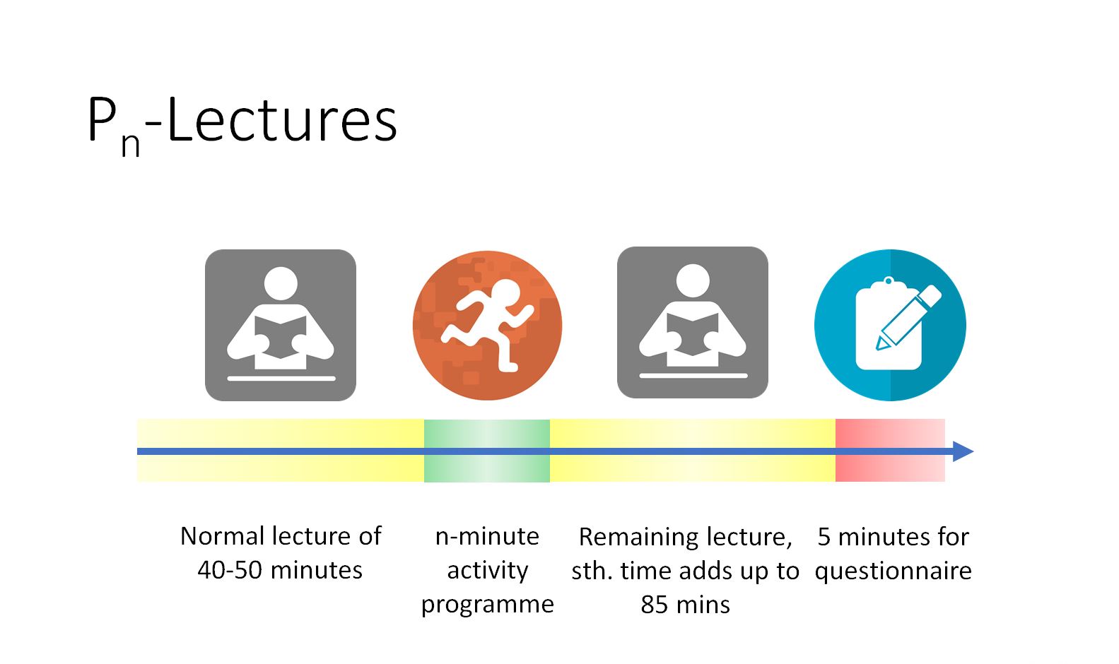In more detail, we conducted two sessions of three weeks each, and three lectures each. In both sessions, there were regular lectures during the first week, which was evaluated by the students. During the second week, we introduced a "normal break" that took 5 minutes in the first session and 10 minutes in the second one. During the last week, we incorporated physical activity during the break, again for 5 minutes in the first session and 10 minutes in the second one. There was an evaluation by the students at the end of each lecture.