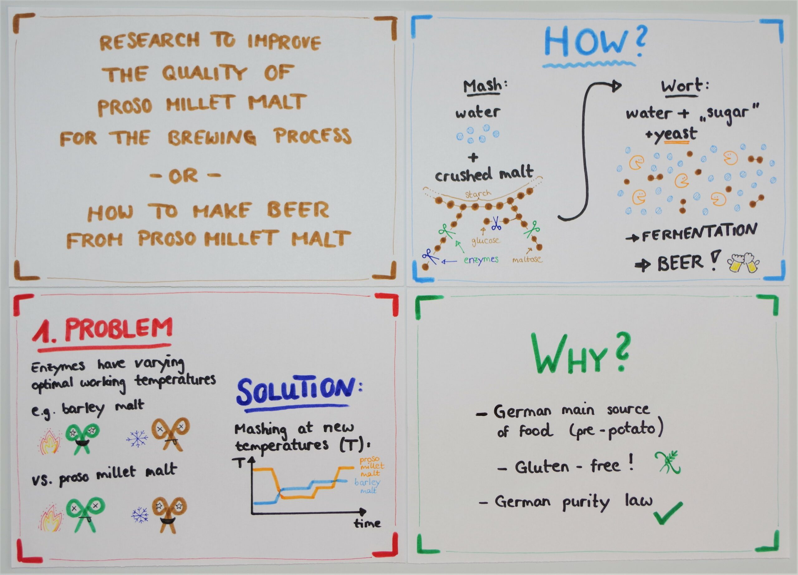 Simplified Abstract: Since the number of celiac disease cases rises globally, the demand for gluten-free beers with proso millet malt as the main ingredient also increases. Yet the problem with proso millet malt is that the wort (= “beer before fermentation”) is lacking quality when being processed the usual way in the brewery. These low-quality worts cause major microbiological and technological problems throughout the whole production process. Therefore, the production of the wort, which is called mashing, needs to be adjusted. During the mashing crushed malt is mixed with water and this mixture is then heated to different temperatures (e.g. 50 to 78 °C for barley malt). There are several temperature rests during which the enzymes in the mash are degrading the malt ingredients (starch, proteins etc.). The most important enzymatic degradation is the breakdown of starch into fermentable sugars. It is very important that the rests are being held at special temperatures, since every enzyme has its optimal working temperature.