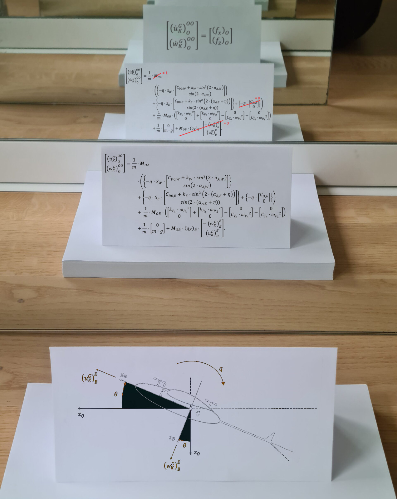 Simplified Abstract: The task of the thesis was to investigate the influence of nonlinear coupling effects on the longitudinal flight dynamics of a Vertical Take-Off and Landing Vehicle (VTOL), a special type of drone. During flight tests, my supervisors project group discovered undesired flight behavior of their real existing VTOL, which did not appear in the full scale, multi degree of freedom simulation model. To examine the correlations between the different actuators, my task was to create a simplified model of the longitudinal dynamics of the VTOL, control it with the applied control algorithm and try to find out the connections that cause the undesired flight behavior. The big aim was to implement counter measures to improve the flight behavior and supply it to the project groups model.